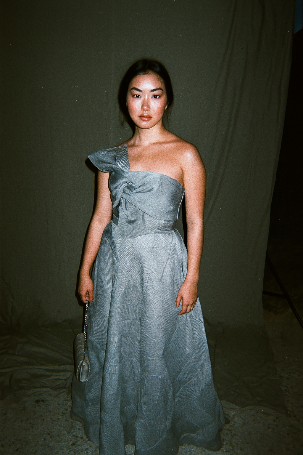 Debbie Co Strapless Top Large Asymmetrical Bow on the Front with Gray Pattered Long Skirt