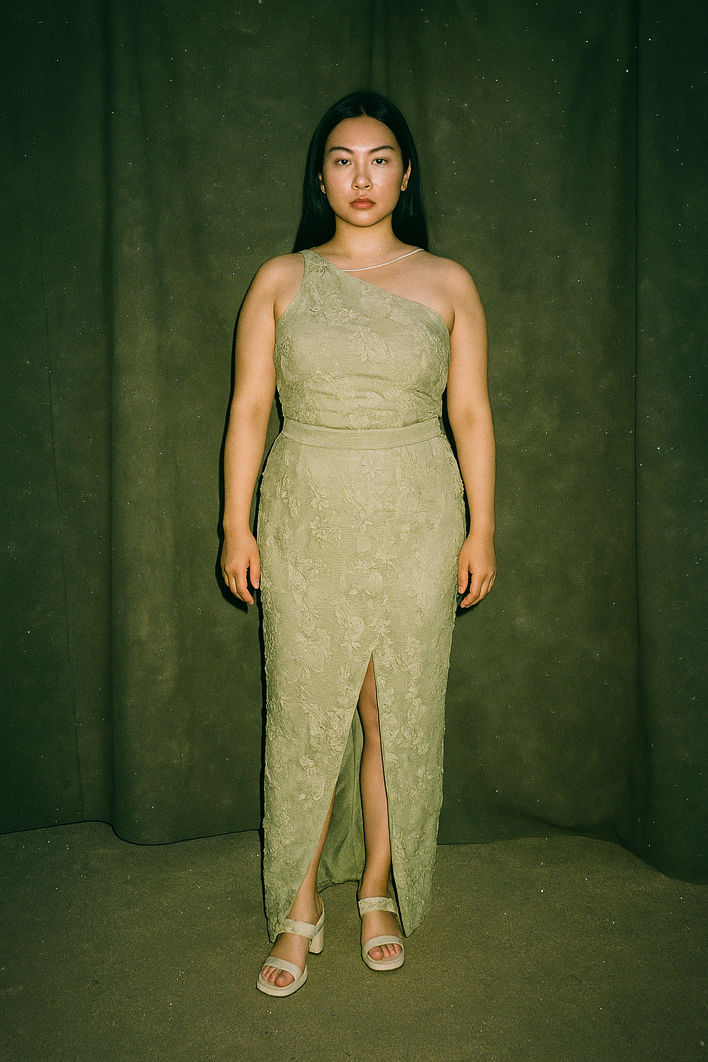 Debbie Co Two Piece Ensemble Green Fabric Floral One Shoulder Crop Top Hightwaist Skirt